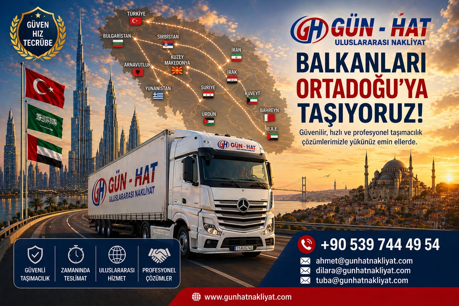 Uluslararası nakliyat firmaları arasında hizmet veren Gün-Hat Nakliyat, balkan ülkeleri ağırlıklı olarak birçok ülkeye Avrupa ülkeleri, Uzakdoğu ülkeleri, Ortadoğu ülkeleri ve Asya ülkelerine ithalat, ihracat, transit, komple ve parsiyel taşımalar konusunda uluslararası karayolu taşımacılık hizmeti vermektedir.
